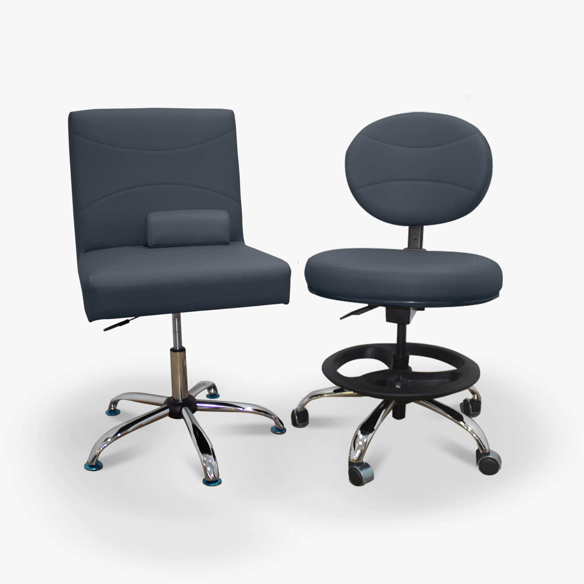 O kit de cadeira para Nail Designer é todo revestido em courvin, possui várias opções de regulagem, apoio para as costas, regulagem de reclínio e altura, apoio para os pés e base estrela cromada polida.